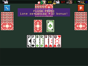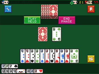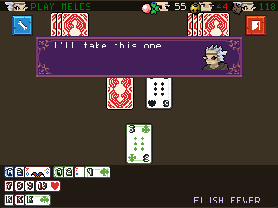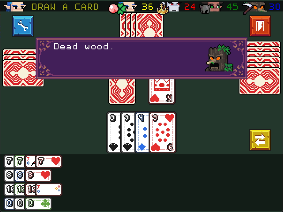 Draw a card. Gains points by laying down melds: three-of-a-kind, four-of-a-kind, or runs of the same suit and extending old ones. Equipped items trigger automatically. First player to finish a hand with the target score takes the match.